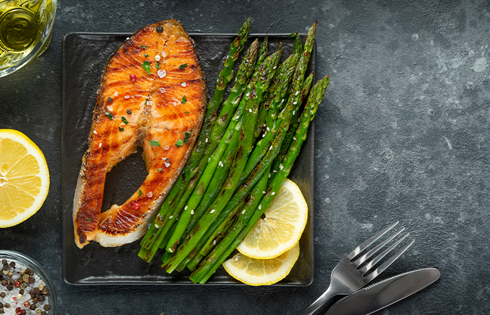 Lachs vom Zedernholz mit geräuchertem Spargel-Brot-Salat und Dijon-Mayonnaise